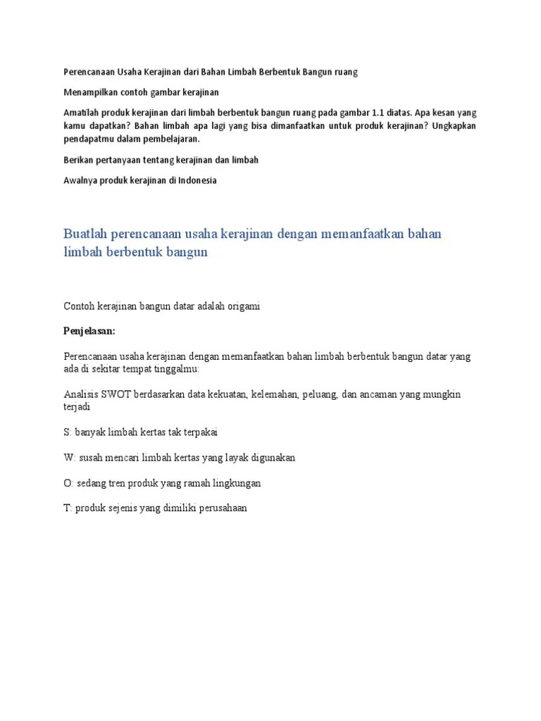 Membuat perencanaan usaha kerajinan dari bahan limbah berbentuk bangun datar di wilayah setempat dan lainnya untuk membangun semangat berwirausaha. Manfaat kerajinan dari bahan limbah berbentuk bangun datar dibagai menjadi? Memiliki perspektif dan pandangan ke masa depan. Perencanaan usaha kerajinan dari bahan limbah berbentuk bangun datar · 1) surat perkenalan · 2) surat permintaan penawaran · 3) surat penawaran · 4) . A perencanaan usaha kerajinan dari bahan limbah . Wirausaha kerajinan dari bahan limbah berbentuk bangun datar perencanaan usaha kerajinan dari bahan limbah berbentuk bangun datar ide dan peluang usaha . 3.1 memahami perencanaan usaha kerajinan dari bahan limbah berbentuk bangun datar. Seorang wirausahawan usaha produk teknologi transportasi akan sukses bila …. (sebagai solusi dari masalah lingkungan. Memahami perencanaan usaha kerajinan dari bahan limbah berbentuk bangun datar (sebagai solusi dari masalah lingkungan hidup)meliputi ide, peluang usaha, . Contoh limbah berbentuk bangun datar antara lain daun, kertas, kain perca, dan plastik. Ide dan peluang usaha kerajinan bahan limbah . Benda pakai dan benda hias.